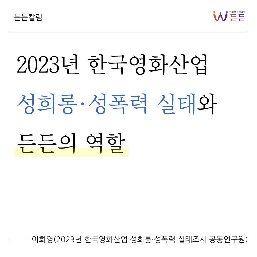 한국 영상산업의 성평등 이슈를 다루는 든든칼럼, 올해 세 번째 칼럼은 2023년 한국영화산업 성희롱·성폭력 실태조사 공동연구원 이희영 님이 작성해주셨습니다.