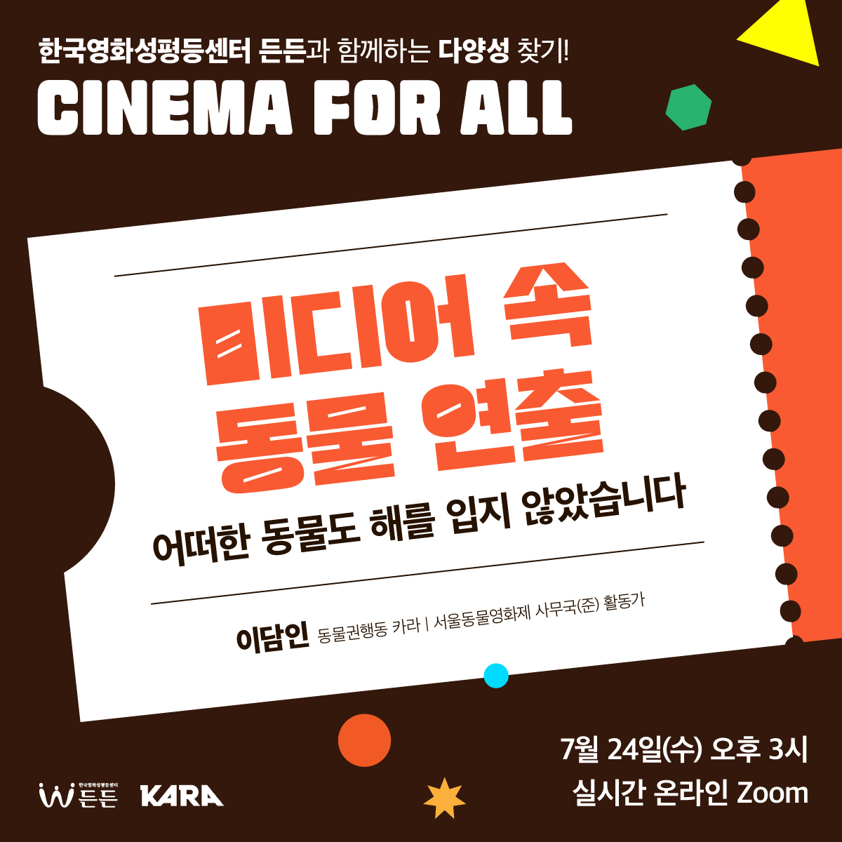 [‘CINEMA FOR ALL’ 1강 안내] ✅ 교육명 : 미디어 속 동물 연출 - 어떠한 동물도 해를 입지 않았습니다 ✅ 강사 : 이담인(동물권행동 카라 서울동물영화제 사무국(준) 활동가) ✅ 일시 : 7월 24일(수) 오후 3시~5시 ✅ 장소 : 실시간 온라인 강의(Zoom) ✅ 교육비 : ✨무료✨ ✅ 교육 대상 : 영상산업 종사자 또는 해당 주제에 관심 있는 ✨누구나✨ ✅ 문의 : 02-739-1087