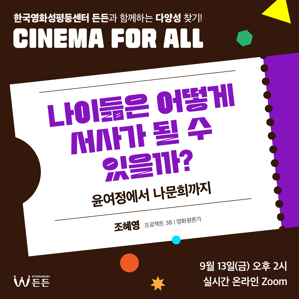 [‘CINEMA FOR ALL’ 3강 안내] ✅ 교육명 : 나이듦은 어떻게 서사가 될 수 있을까? : 윤여정에서 나문희까지 ✅ 강사 : 조혜영(프로젝트 38 / 영화평론가) ✅ 일시 : 9월 13일(금) 오후 2시~4시 ✅ 장소 : 실시간 온라인 강의(Zoom) ✅ 교육비 : ✨무료✨ ✅ 교육 대상 : 영상산업 종사자 또는 해당 주제에 관심 있는 ✨누구나✨ ✅ 문의 : 02-739-1087