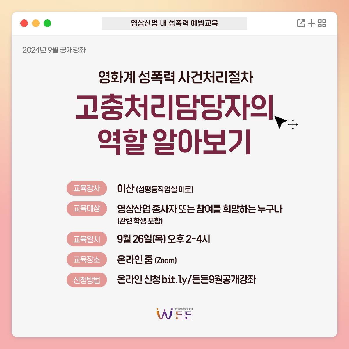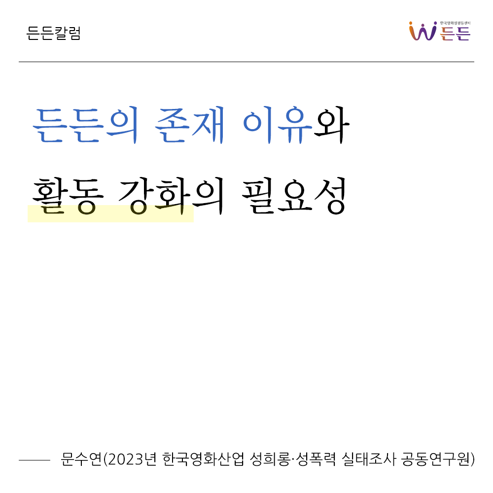 한국 영상산업의 성평등 이슈를 다루는 든든칼럼, 올해 다섯 번째 칼럼은 문수연 2023년 한국영화산업 성희롱·성폭력 실태조사 공동연구원이 작성해주셨습니다.