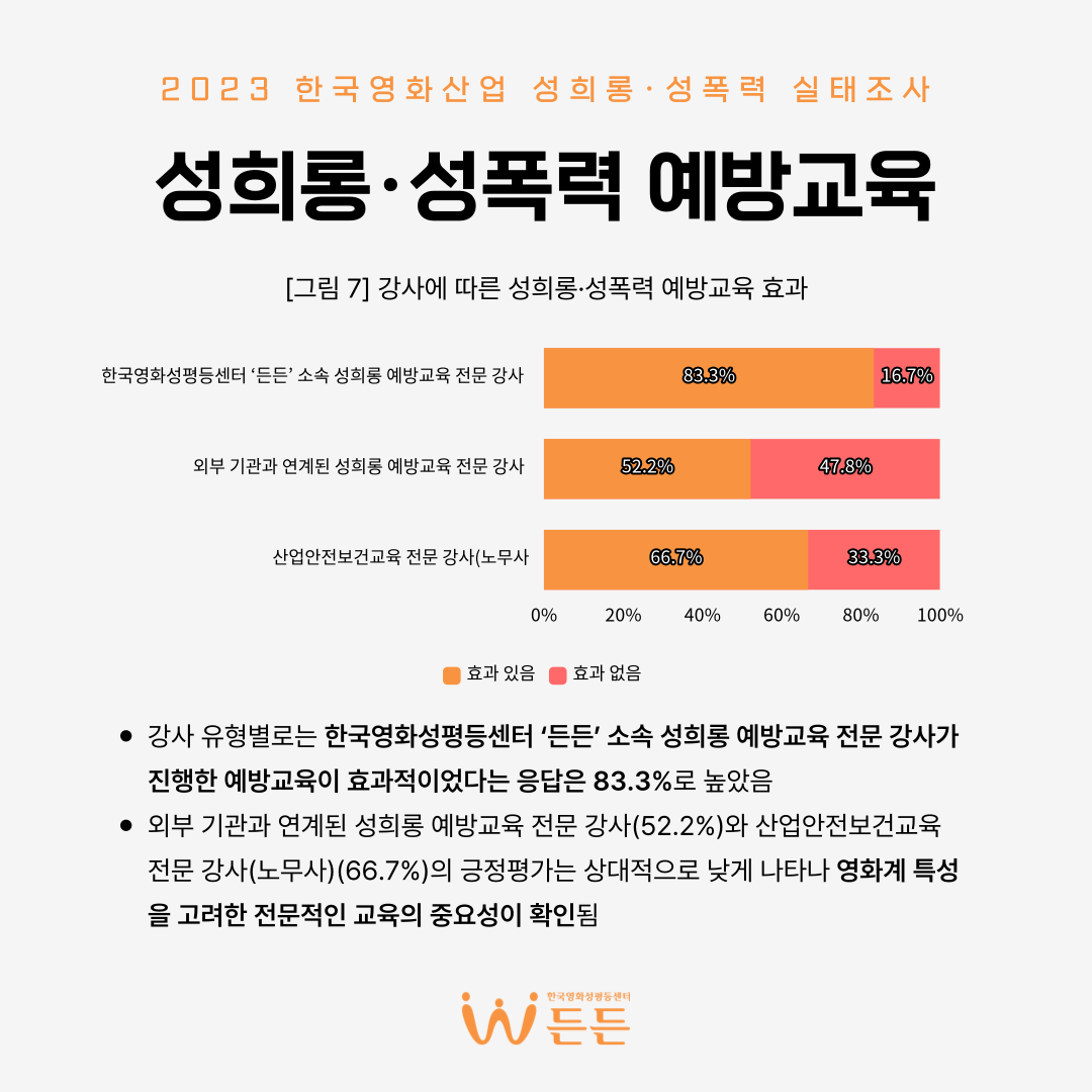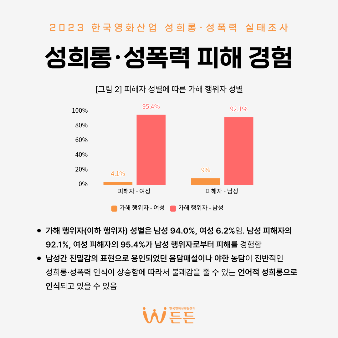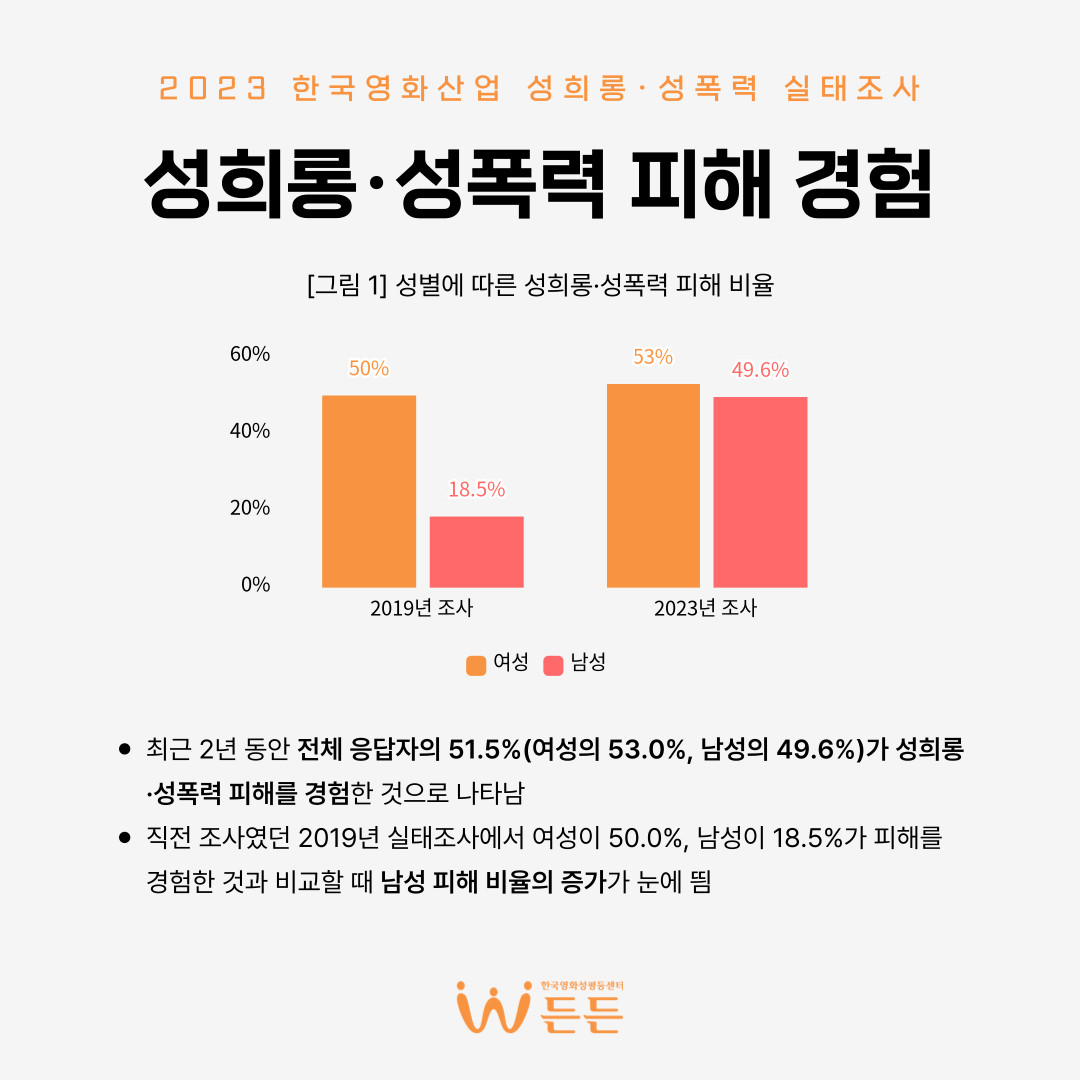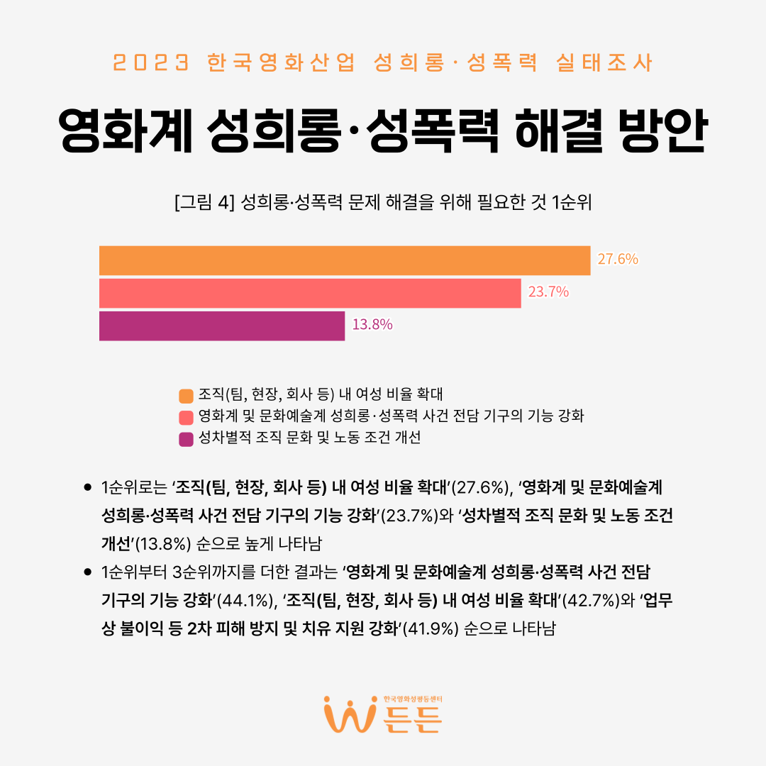 💬 "2023년 실태조사 참여자들은 영화계 성폭력 문제 해결 방안으로 ‘영화계 및 문화예술계 성희롱·성폭력 전담 기구의 기능 강화’(44.1%)를 가장 많이 꼽았고, ‘여성 비율 확대’(42.7%)와 ‘업무상 불이익 등 2차 피해 방지 및 치유 지원 강화’(41.9%)가 뒤를 이었다. 이러한 결과는 든든의 역할 강화 및 확대의 중요성이 영화인들에게도 체감되고 있음을 보여준다."