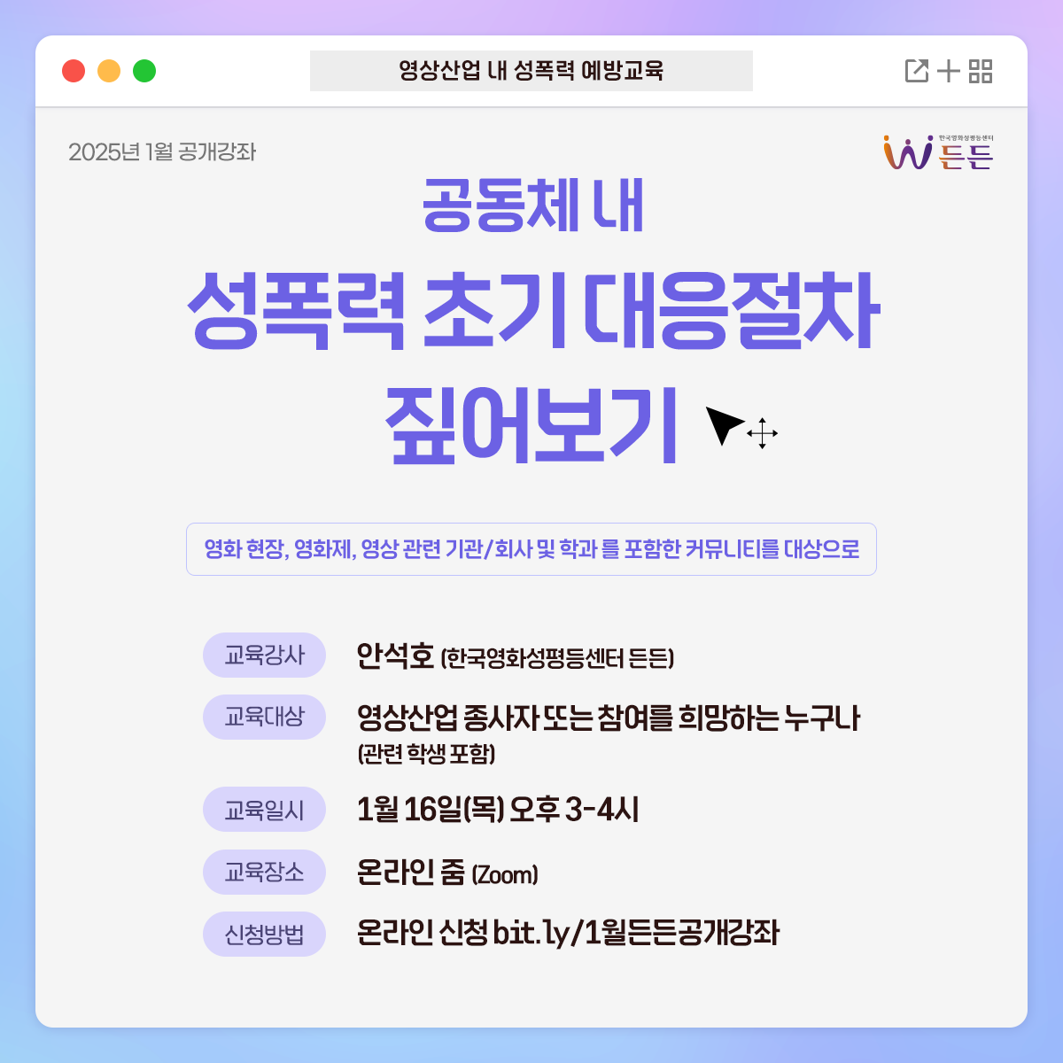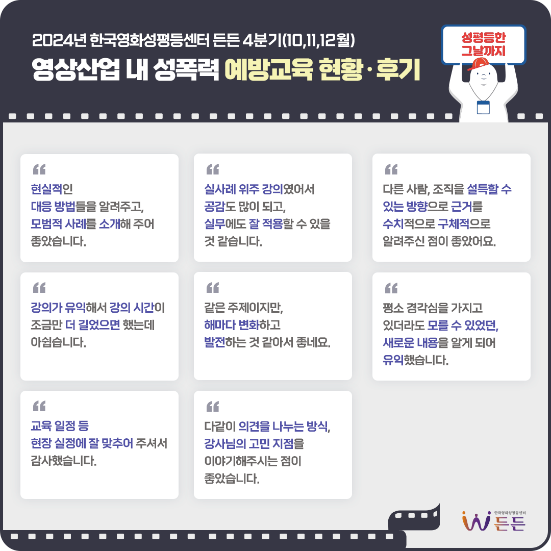 2024년 4분기 든든의 영상산업 내 성폭력 예방교육은 총 29회 진행되었으며, 364명이 수강하였습니다. 든든의 분기별 예방교육 현황 및 수강생 후기는 아래 버튼 클릭 시 확인할 수 있습니다. 든든은 수강생분들의 피드백을 꼼꼼히 확인하고, 또 적극적으로 반영하려고 항상 노력하고 있으니 앞으로도 많은 참여 부탁드립니다!