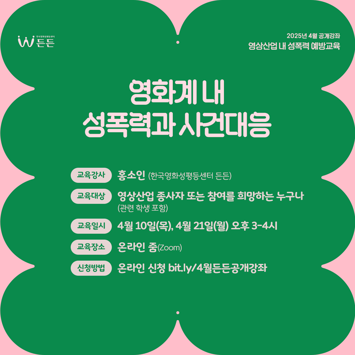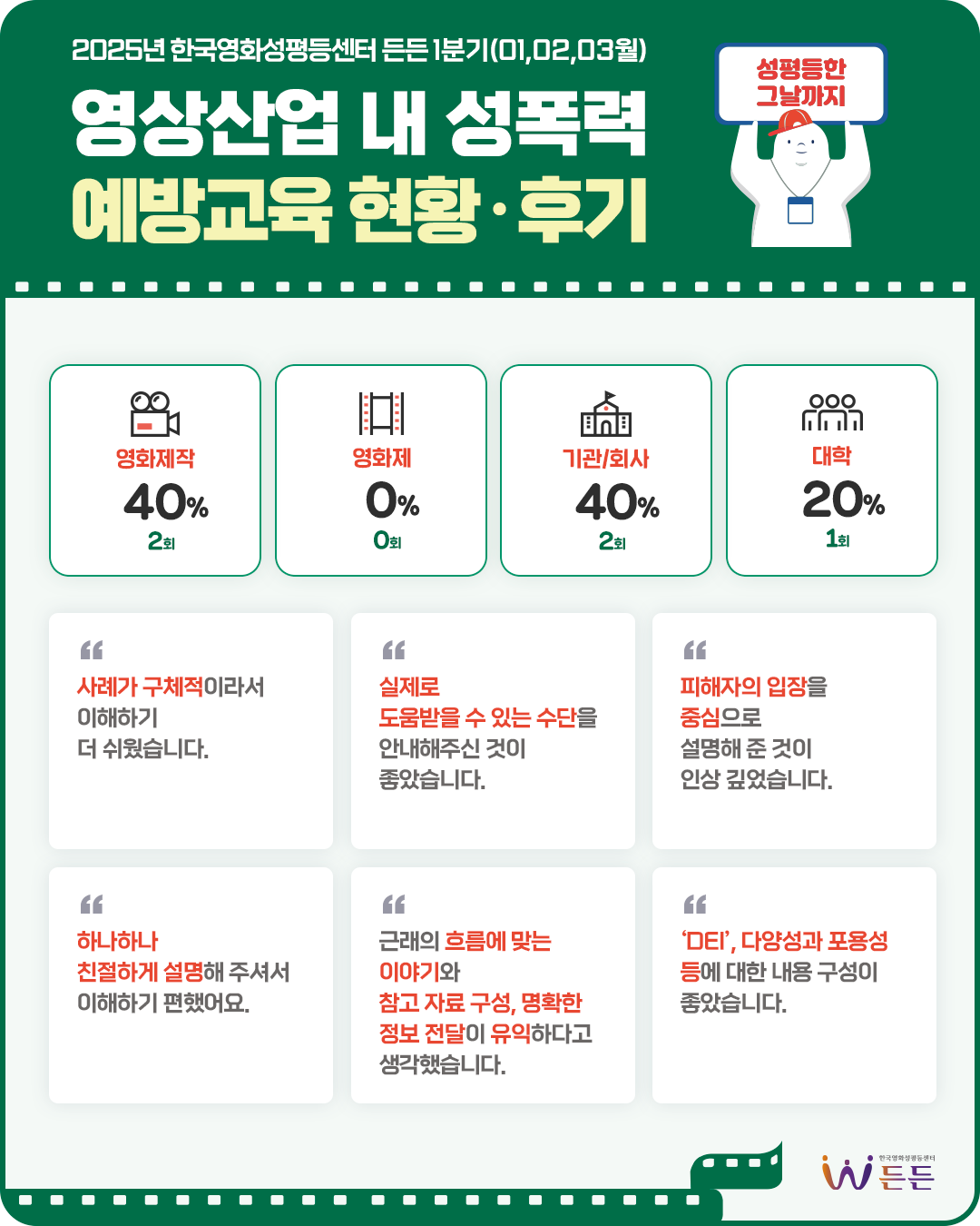 2025년 1분기 든든의 영상산업 내 성폭력 예방교육은 총 5회 진행되었으며, 173명이 수강하였습니다. 든든의 분기별 예방교육 현황 및 수강생 후기는 아래 버튼 클릭 시 확인할 수 있습니다. 든든은 수강생분들의 피드백을 꼼꼼히 확인하고, 또 적극적으로 반영하려고 항상 노력하고 있으니 앞으로도 많은 참여 부탁드립니다!