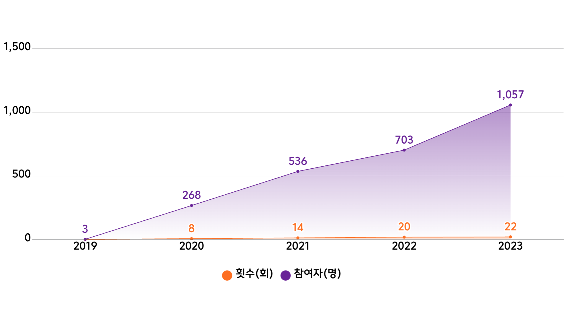 올해 정기 교육의 수강생이 작년 12월 기준(703명)보다 354명 많아져, 참여율이 증가했다는 것을 눈여겨볼 필요가 있습니다. 이러한 경향이 나타나는 이유로는 영화제작 전의 성폭력 예방교육 수강이 의무화된 것(영화 및 비디오물의 진흥에 관한 법률 제3조, 영화제작 전 성폭력 예방교육 의무화 시행 2021.8.19.)과 더불어 다양한 주제의 성평등 강의에 관한 관심이 높아지고 있는 것 또한 생각해볼 수 있을 것 같습니다. 혹은 개인 및 소수 인원 단위의 제작 현장 수가 증가하는 추세일 수도 있습니다. |