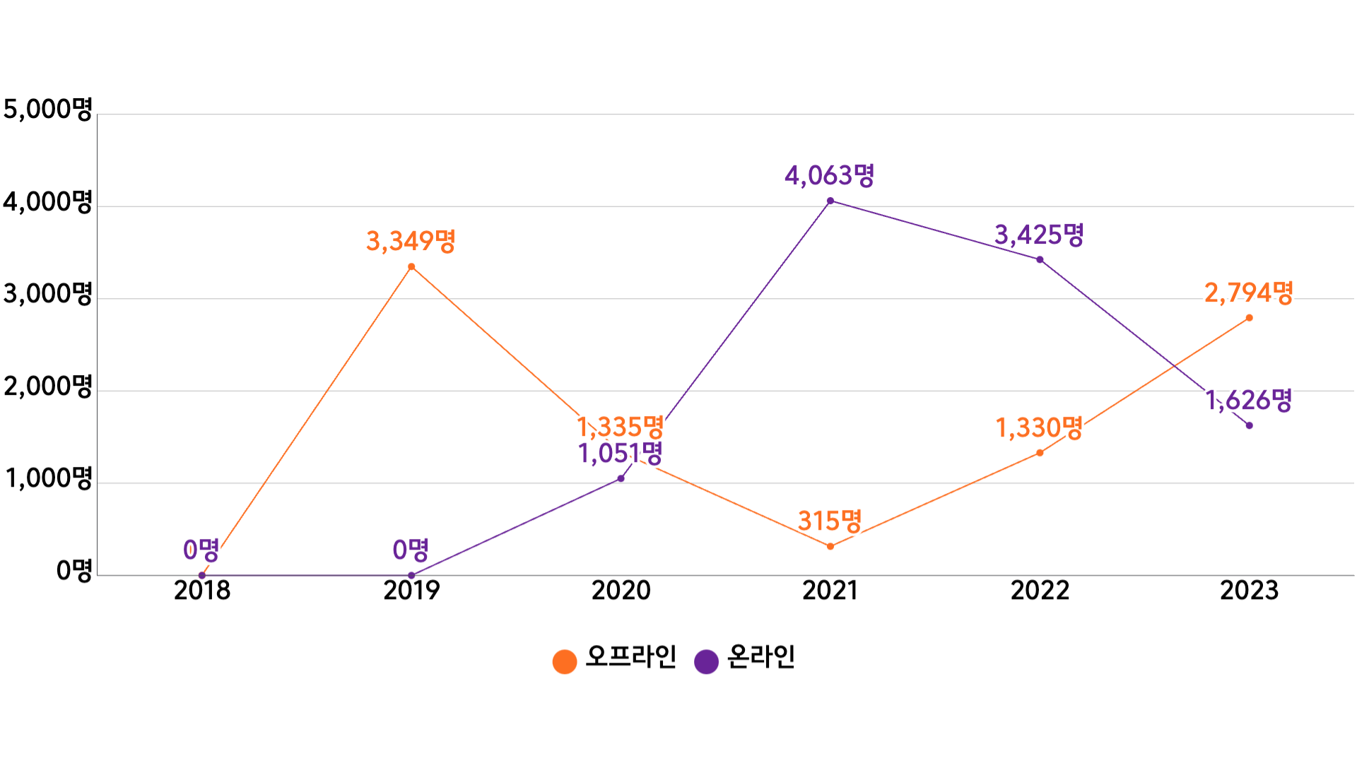 수시 교육의 경우 작년까지는 온라인 방식의 교육 수강 인원이 증가하는 추세였는데 올해에 들어서는 오프라인 수강 인원의 비중이 증가하였습니다. 수시 교육에 한해서 영화영상인들의 성폭력 예방교육 참여 방식에 대한 선호 양상이 달라지고 있는 것인지 앞으로 주목할 필요가 있어 보입니다.