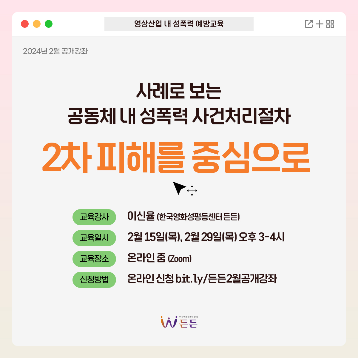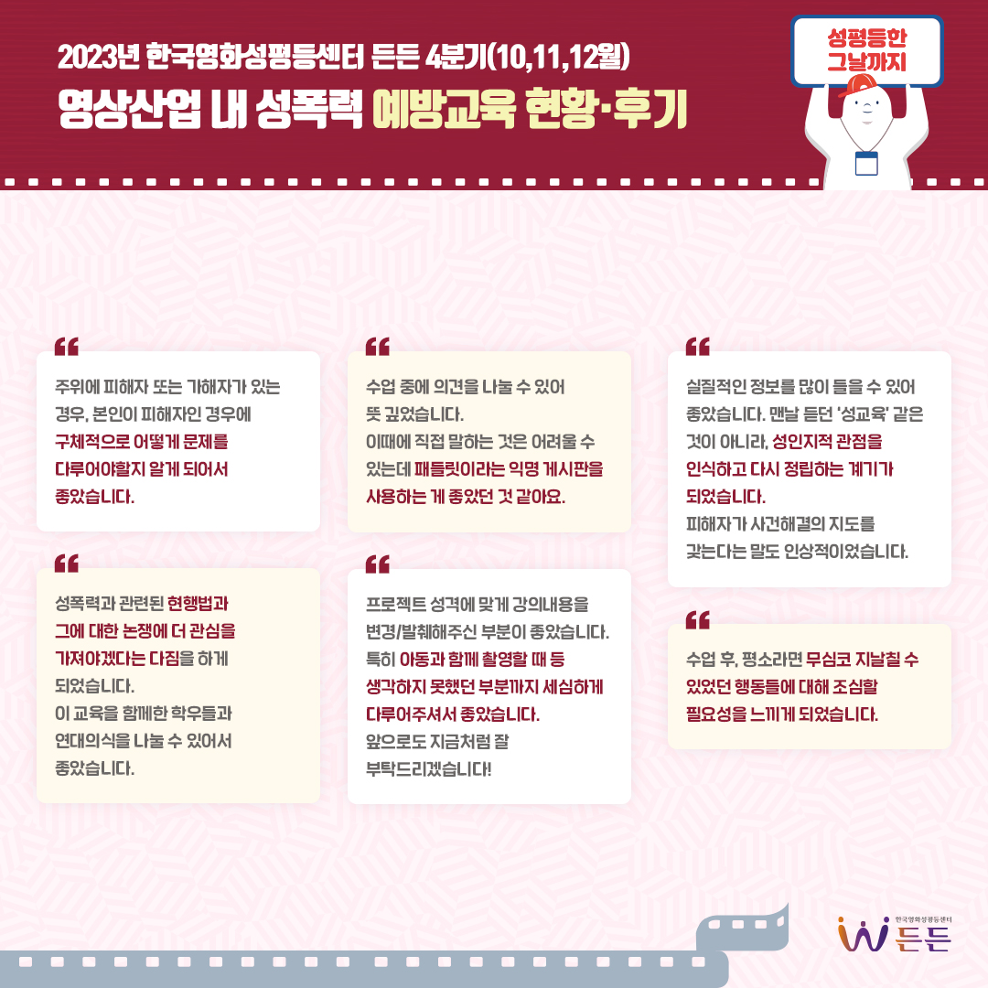 2023년 4분기 든든의 영상산업 내 성폭력 예방교육은 총 35회 진행되었으며, 729명이 수강하였습니다. 든든의 분기별 예방교육 현황 및 수강생 후기는 🔗링크에서 확인할 수 있습니다. 든든은 수강생분들의 피드백을 꼼꼼히 확인하고, 또 적극적으로 반영하려고 항상 노력하고 있으니 앞으로도 많은 참여 부탁드립니다!